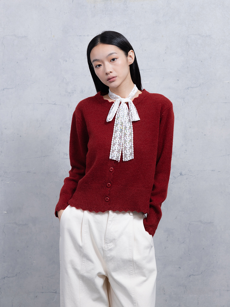紅色針織外套、紅色細節上衣,